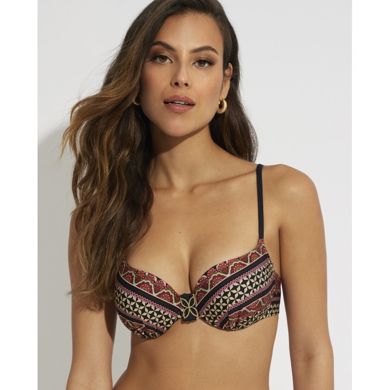 Top de biquíni com armação e copa de espuma. Com alças que proporcionam suporte perfeito e máximo conforto. Com um padrão geométrico de estilo étnico inspirado em desenhos tribais e detalhes únicos que lhe conferem um toque autêntico e original.