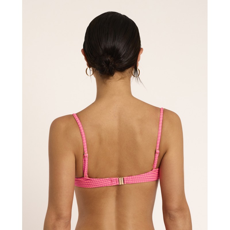 Top de biquíni com armação e copa. Oferece uma sustentação perfeita e o máximo conforto. Esta peça luminosa, com um delicado design entrançado, realça a silhueta de forma subtil e elegante, enquanto o acessório embutido acrescenta um toque de originalidade ao look.