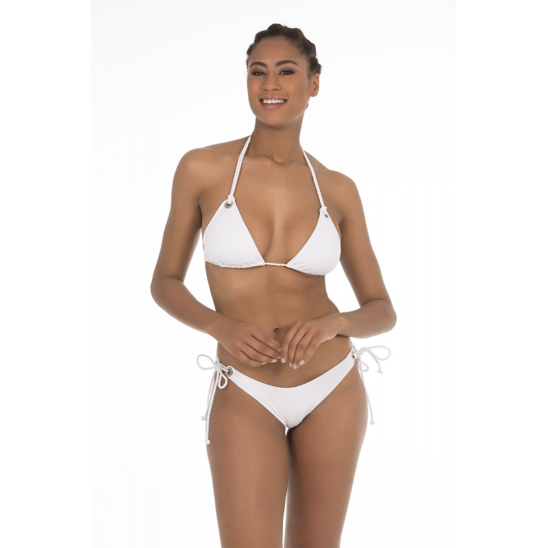 Top de bikini de cortina multiposição. Con copa amovível e cinco possiveis possições. De corte clássico. Em branco.