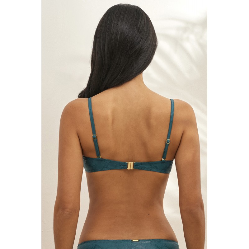 Top de bikini semi-balconette com armação. Com alças multiposições. Com um espetacular tecido reciclado, esta coleção tem um brilho muito especial que vai captar todos os olhares nesta estação.