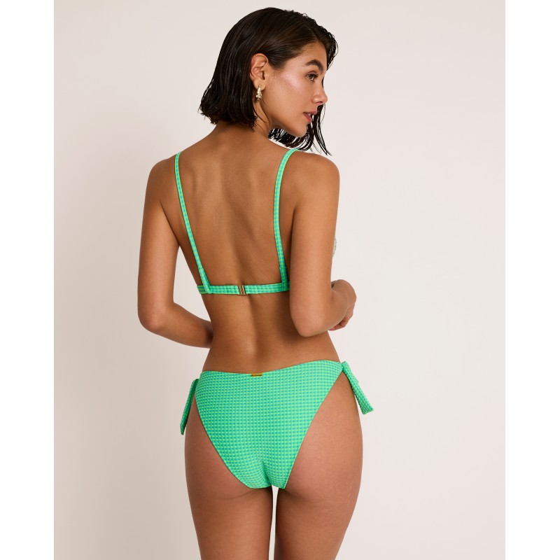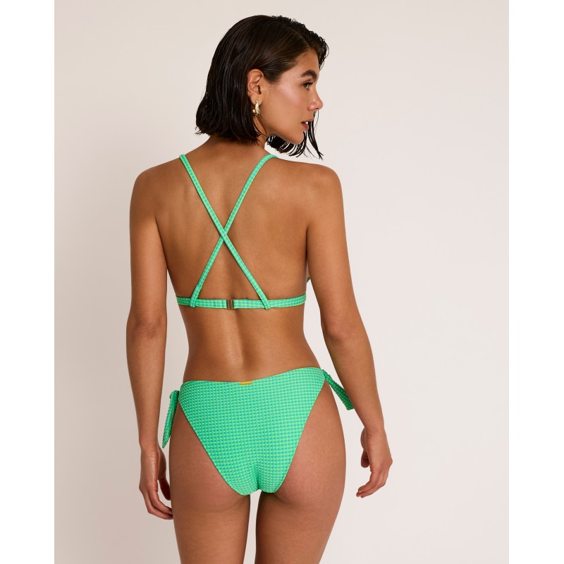 Top de biquíni com decote triangular. Possui bojo e alças ajustáveis ​​em múltiplas posições. Esta peça luminosa, com um delicado padrão entrançado, realça a silhueta de forma subtil e elegante, enquanto o acessório embutido acrescenta um toque de originalidade ao look.