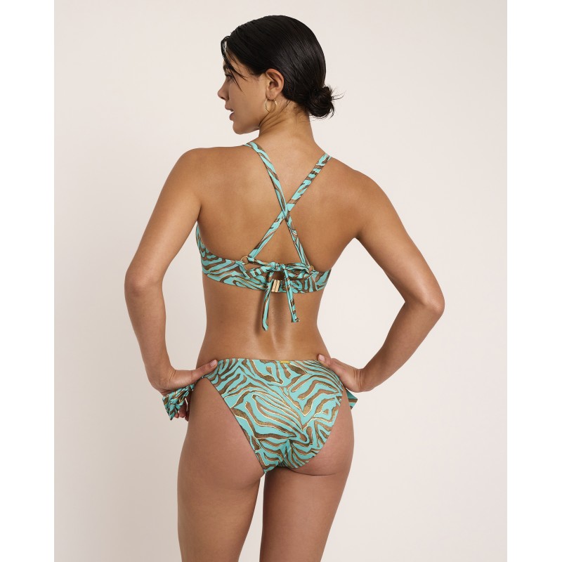Top de biquíni com decote triangular. Com aro, sem copa e alças ajustáveis ​​em várias posições para um ajuste perfeito. Apresenta um estampado animal orgânico que transmite instinto, força e liberdade, celebrando uma feminilidade confiante e poderosa. Parte da coleção Utopia, onde o impossível se torna realidade.