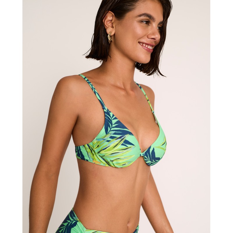 Top de biquíni triangular com aro e sem enchimento. Apresenta um estampado tropical e cores vibrantes que evocam o verão. Perfeito para aproveitar o sol nesta estação. Feito com materiais reciclados.