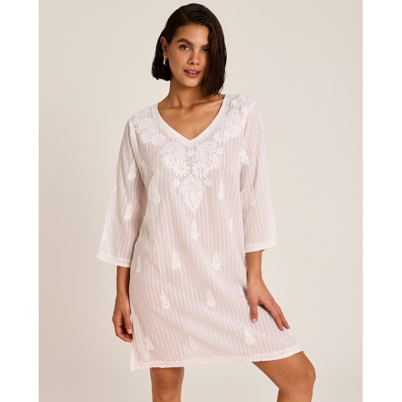 Vestido curto estilo túnica. Com bordados requintados que conferem um toque de frescura e originalidade, este vestido é uma peça verdadeiramente única. Perfeito para usar por cima do biquíni ou fato de banho.