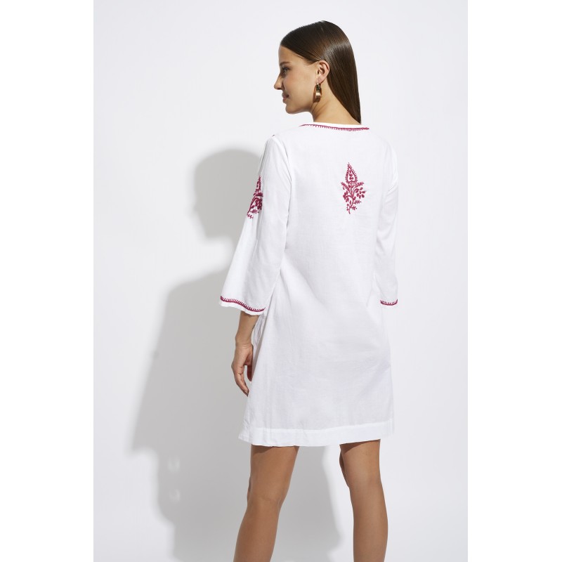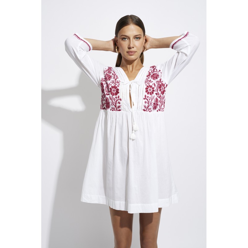 Vestido curto bordado. Com mangas leves, tecido fino e bordados delicados na frente, mangas e costas.