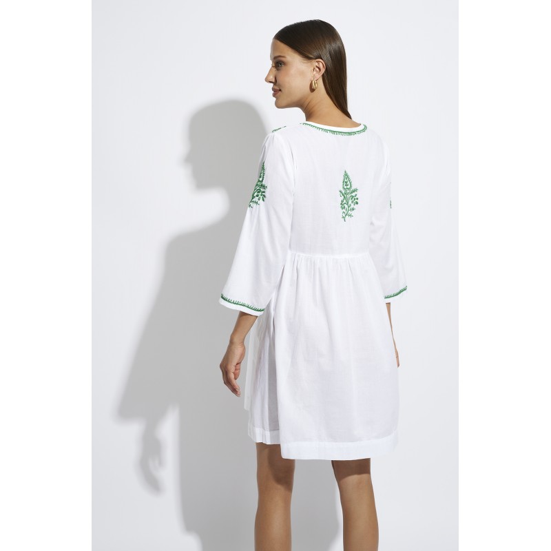 Vestido curto bordado. Com mangas leves, tecido fino e bordados delicados na frente, mangas e costas.