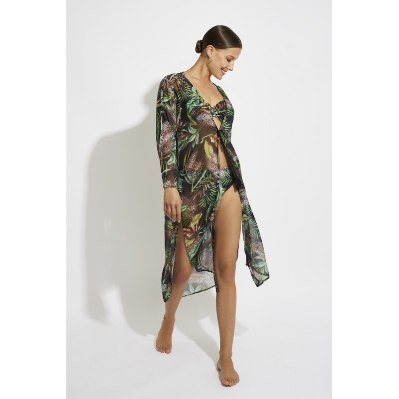 Vestido em tecido muito fresco com mangas. Ideal para usar por cima do bikini ou fato de banho nesta estação.