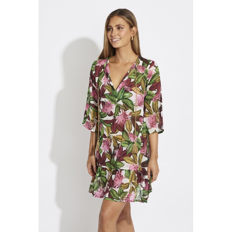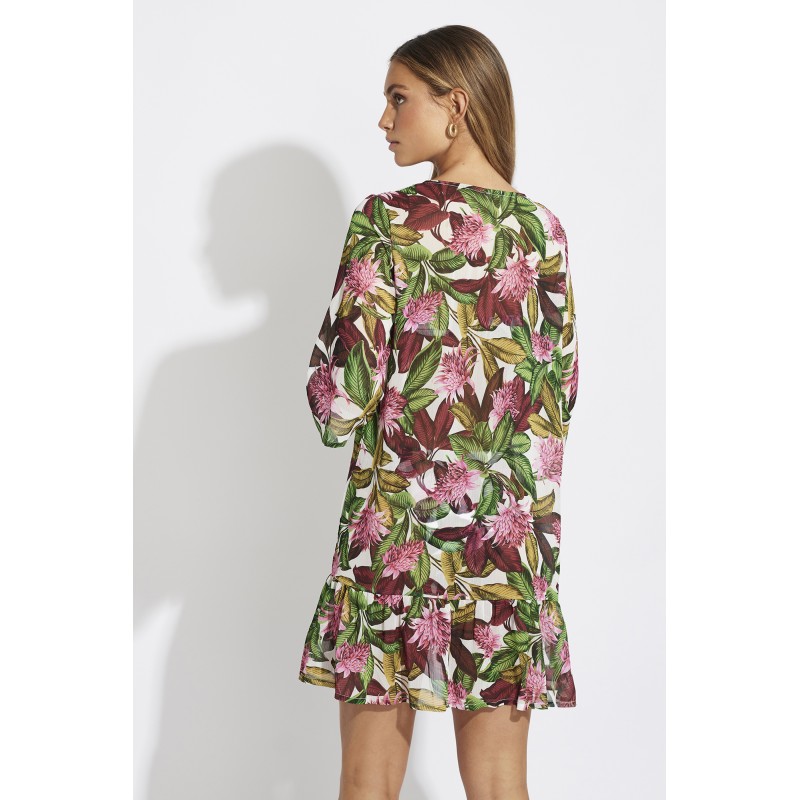 Vestido curto com mangas. Um design muito verão com uma estampa tropical. Ideal para usar por cima do bikini ou fato de banho.
