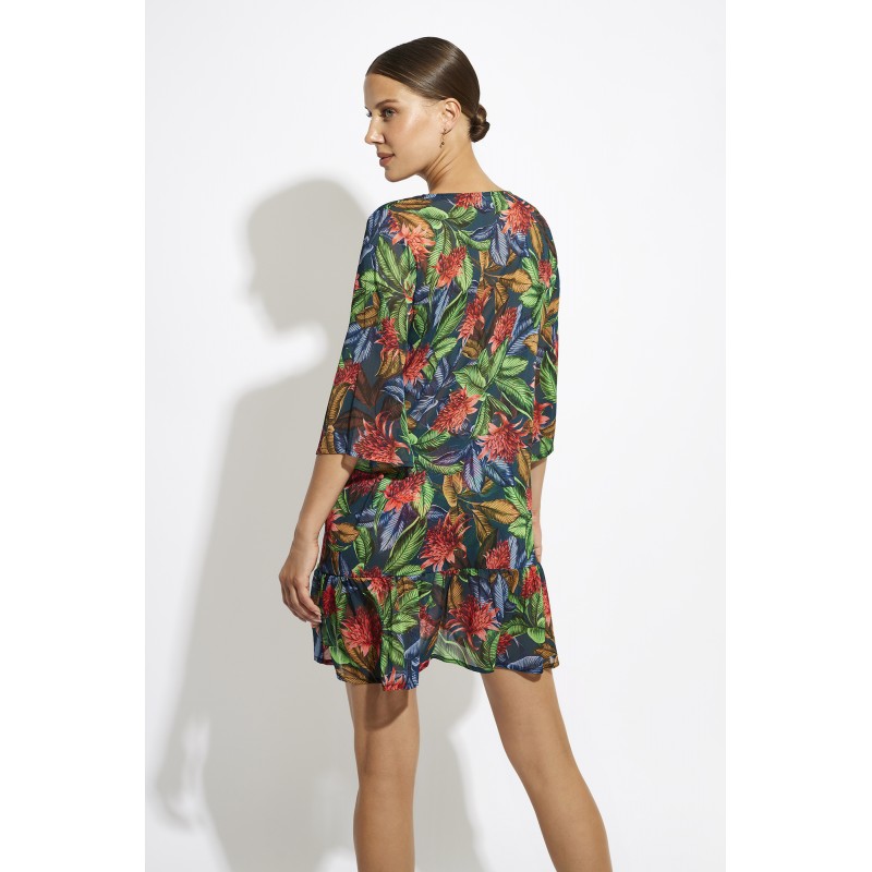 Vestido curto com mangas. Um design muito verão com uma estampa tropical. Ideal para usar por cima do bikini ou fato de banho.