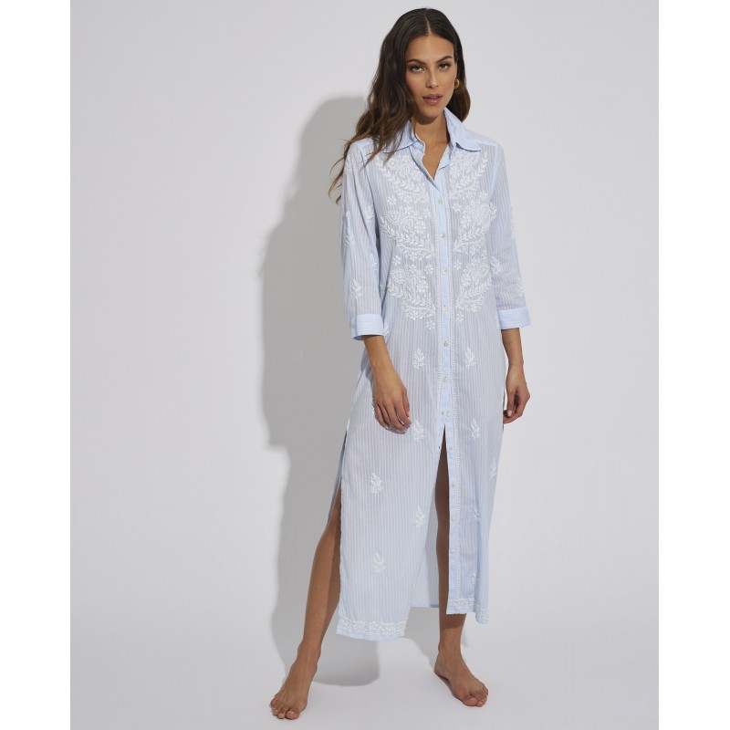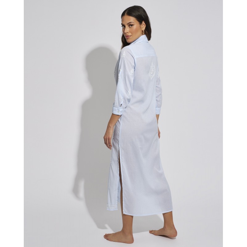Vestido longo estilo camisa com botões na frente. Uma peça muito versátil com um bordado muito feminino e jovem.