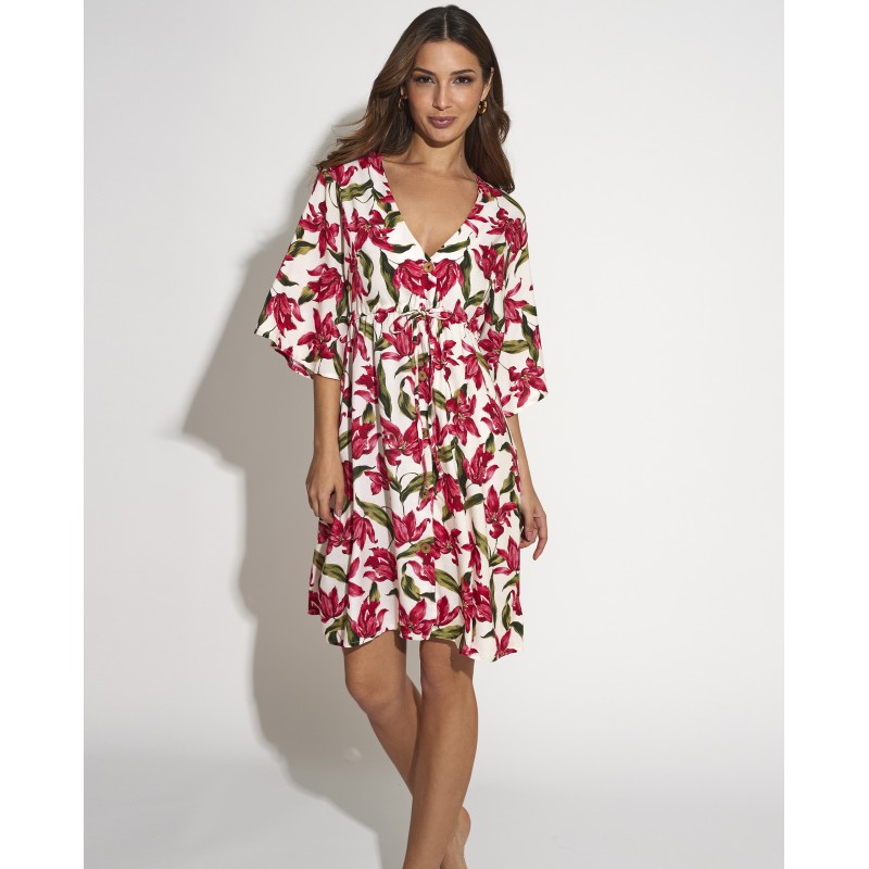 Vestido curto com mangas. Com estampa tropical que evoca a beleza de uma ilha paradisíaca. A sua cor e frescura transmitem a alegria e a energia da estação mais esperada do ano. Ideal para usar por cima do biquíni ou maiô neste verão.