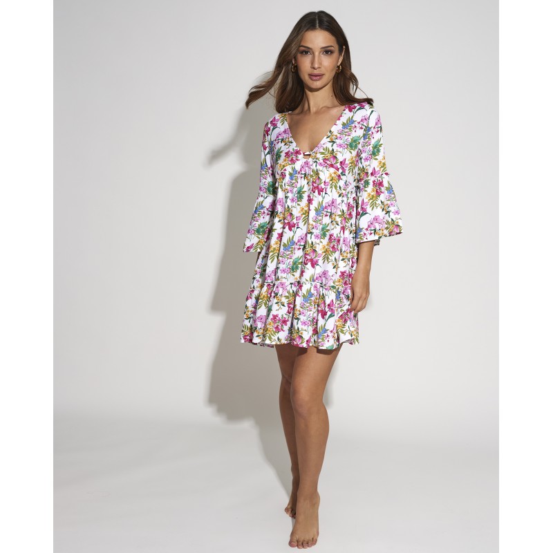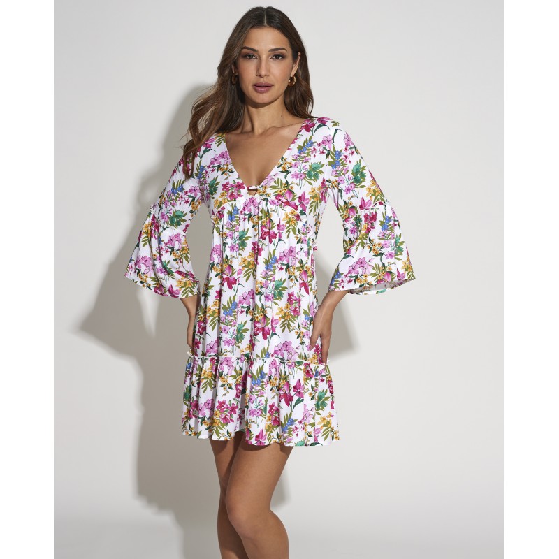 Vestido curto com mangas. Este design floral e colorido é perfeito para usar por cima do biquíni ou maiô e ficar radiante e vibrante na praia ou piscina neste verão.