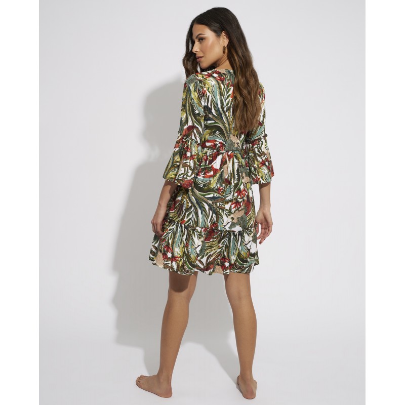 Vestido curto com mangas. Este design espetacular com tons vibrantes inspirados na flora e fauna selvagens reflete a exuberância e vitalidade da natureza tropical selvagem. Ideal para usar a combinar com o seu biquíni ou fato de banho.