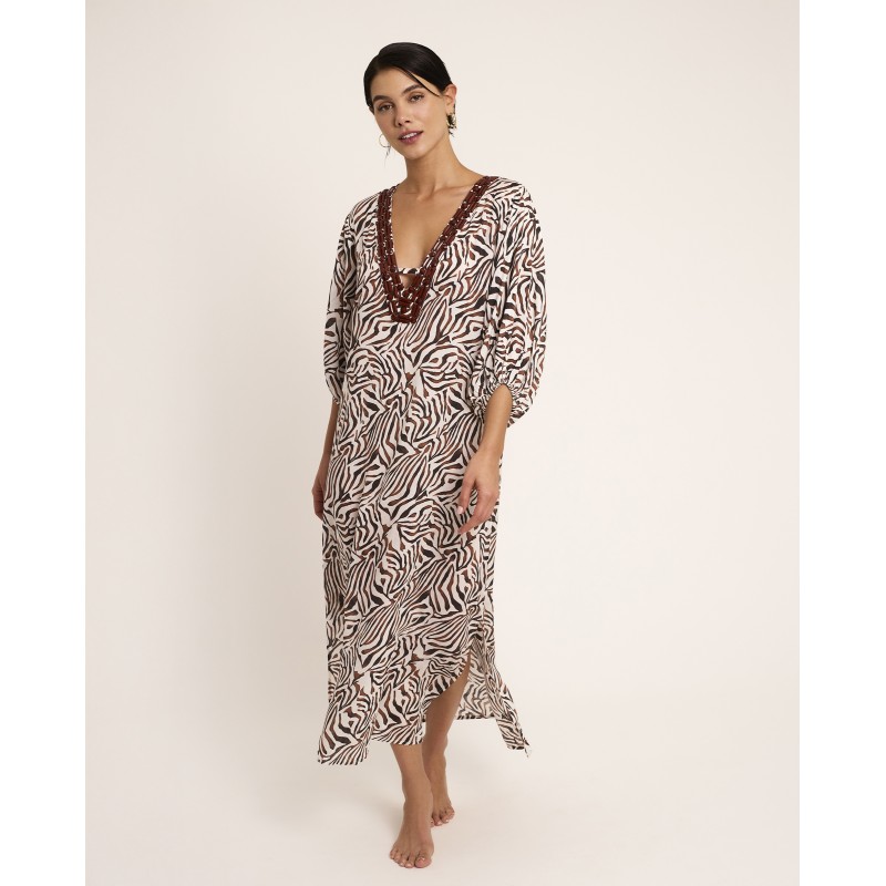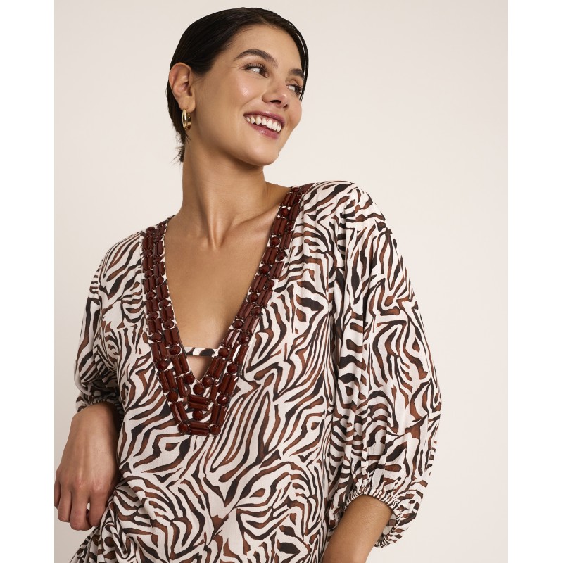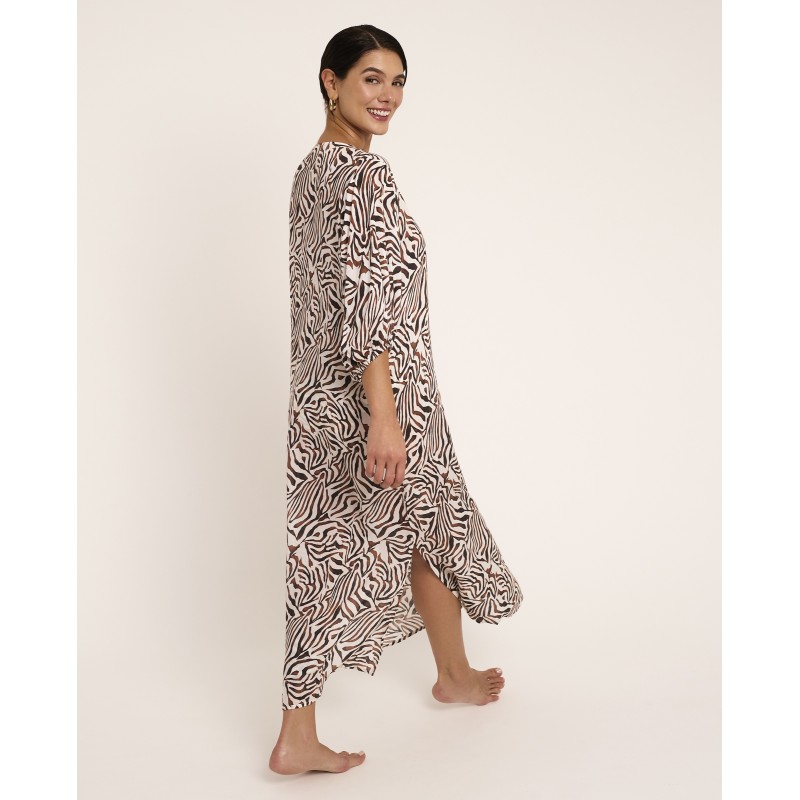 Vestido comprido estilo blusão com mangas e decote adornado com pedras. Apresenta um estampado animal orgânico que transmite instinto, força e liberdade, celebrando uma feminilidade confiante e poderosa. Parte da coleção Utopia, onde o impossível se torna realidade. Complete o seu look de verão com esta peça.