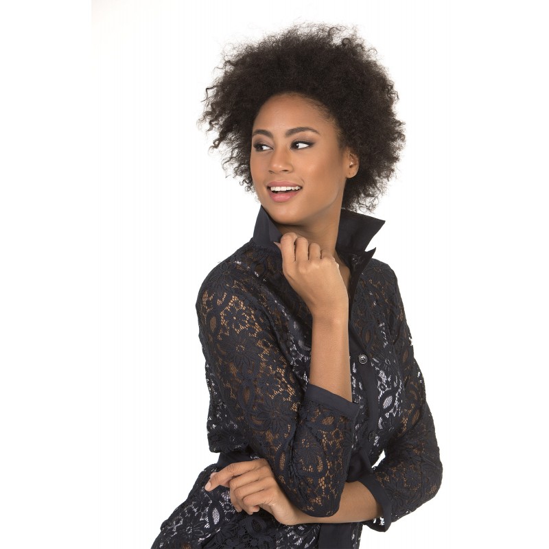 Vestido camiseiro de manga comprida. Com gola de camisa e fecha com um laço. Em rendaEm azul.