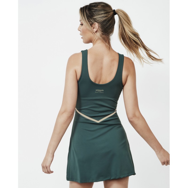 Este vestido desportivo faz parte da nova coleção Selmark Tech de Pilar Rubio. É um conjunto de duas peças numa só: um macacão com parte interior da perna e um vestido exterior. Possui um bolso interior na coxa para guardar uma bola. Uma peça elegante e confortável.