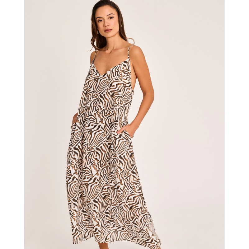 Vestido comprido com alças ajustáveis. Apresenta um estampado animal orgânico que transmite instinto, força e liberdade, celebrando uma feminilidade confiante e poderosa. Parte da coleção Utopia, onde o impossível se torna realidade. Complete o seu look de verão com esta peça.