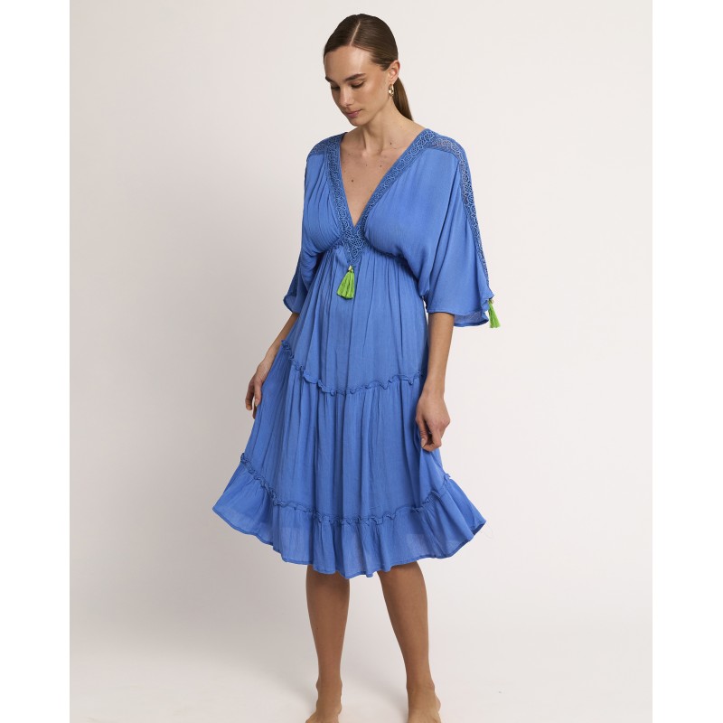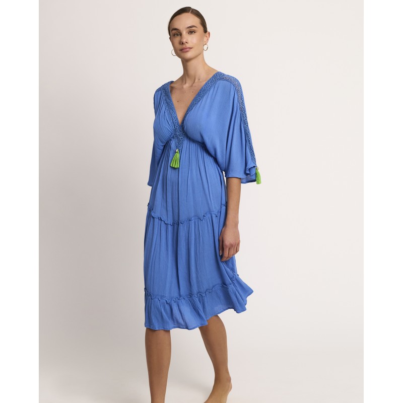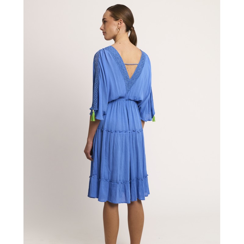 Vestido de mulher de estilo boémio com mangas. Esta peça, com a sua tonalidade luminosa e delicado padrão de trama, é ideal para usar por cima do biquíni ou fato de banho. Os detalhes incorporados na frente e nas mangas acrescentam um toque de originalidade ao look.