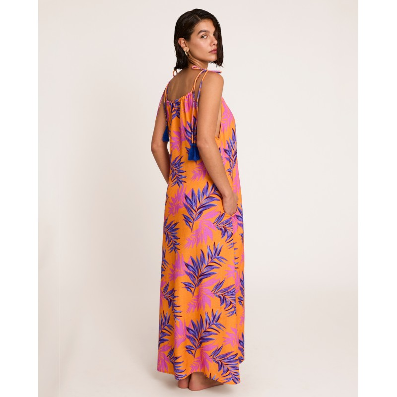 Vestido comprido e fluído com decote halter e alças finas. Apresenta um estampado de inspiração tropical e cores vibrantes que evocam o verão. Perfeito para aproveitar o sol nesta estação. Feito com materiais reciclados.